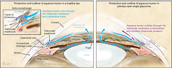 The Intra Ocular Pressure (IOP) : the eye maintains a pressure called Intra Ocular like the body maintains blood pressure in the blood vessels. Ciliary body inside the eye secretes nourishing fluid (Aqueous Humor) to provide nutrition to the crystalline lend and cornea the transparent lenses of the eye. These lenses do not have any direct blood supply. The aqueous humor after providing nourishment to the lenses find micro channels for their exit in the angle of the anterior chamber (trabecular meshwork). Fluctuation between secretion and drainage cause variation in the Intra Ocular Pressure. The normal range of variation in between 3-5 mm Hg. Fluctuation and high intra ocular pressure is responsible for damage to the periphery retina which causes loss of field of vision. The second possible cause of loss of peripheral vision is not related to the IOP, but is caused independently by a reduced blood supply to the peripheral retina. Thus there is clinical condition called as Normo-tensive Glaucoma.
